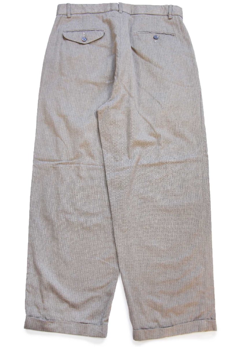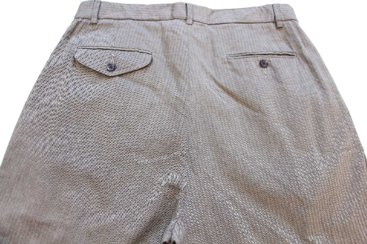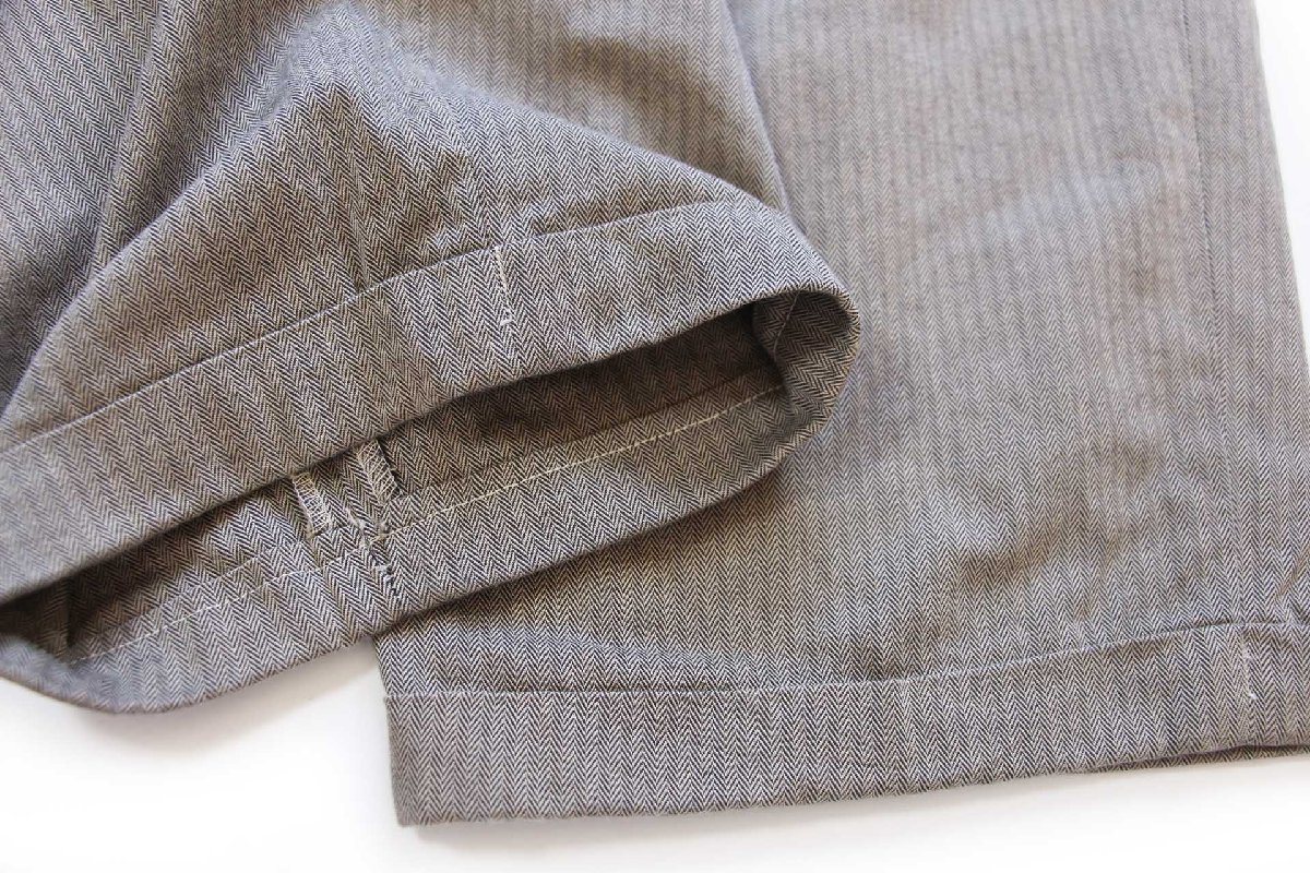 ツータック、フロントジップフライ(YKK)、ヒップポケットは両玉縁、裾はダブル