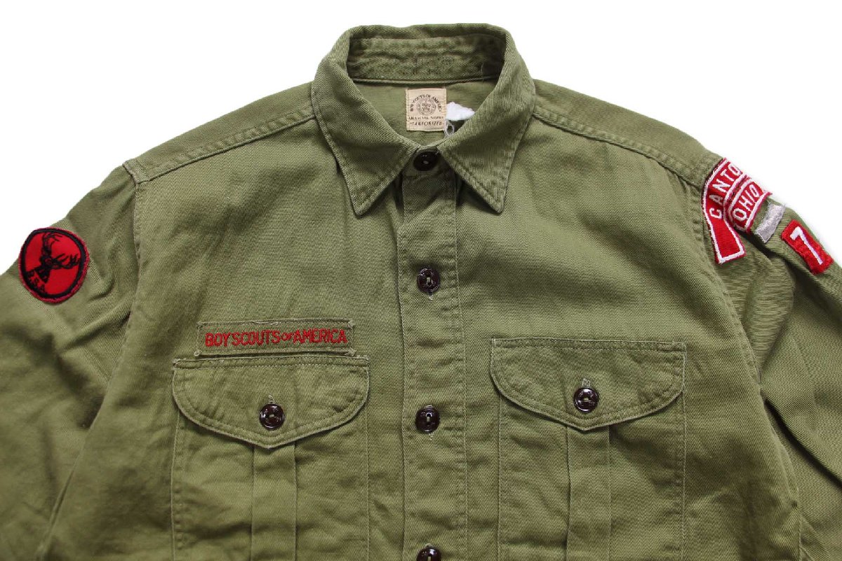 60s BSA ボーイスカウト パッチ付き コットンツイルシャツ オリーブ 13.5