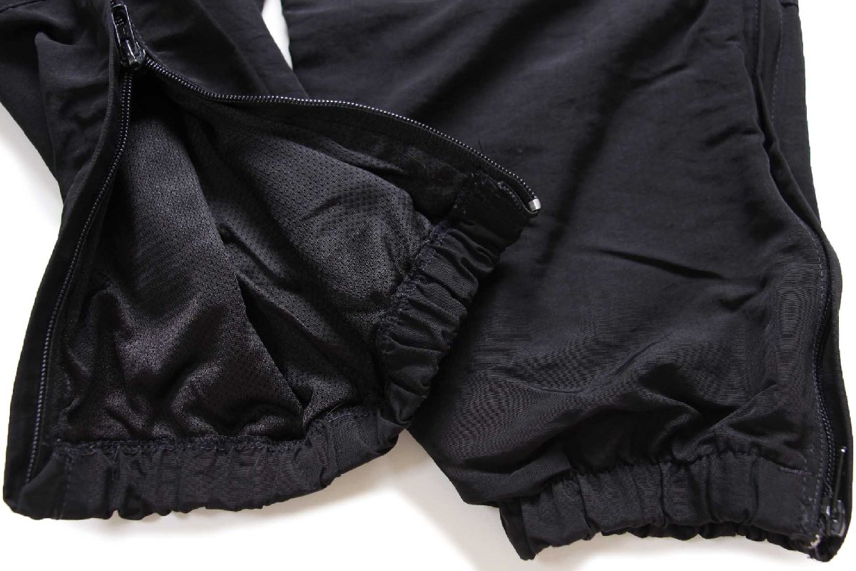 ウエストにゴム&ドローコードあり、サイドポケットあり、裾にジップあり、右ポケット内にネームタグあり、裏地はメッシュ、ヒザとヒップは生地が二重になっています。