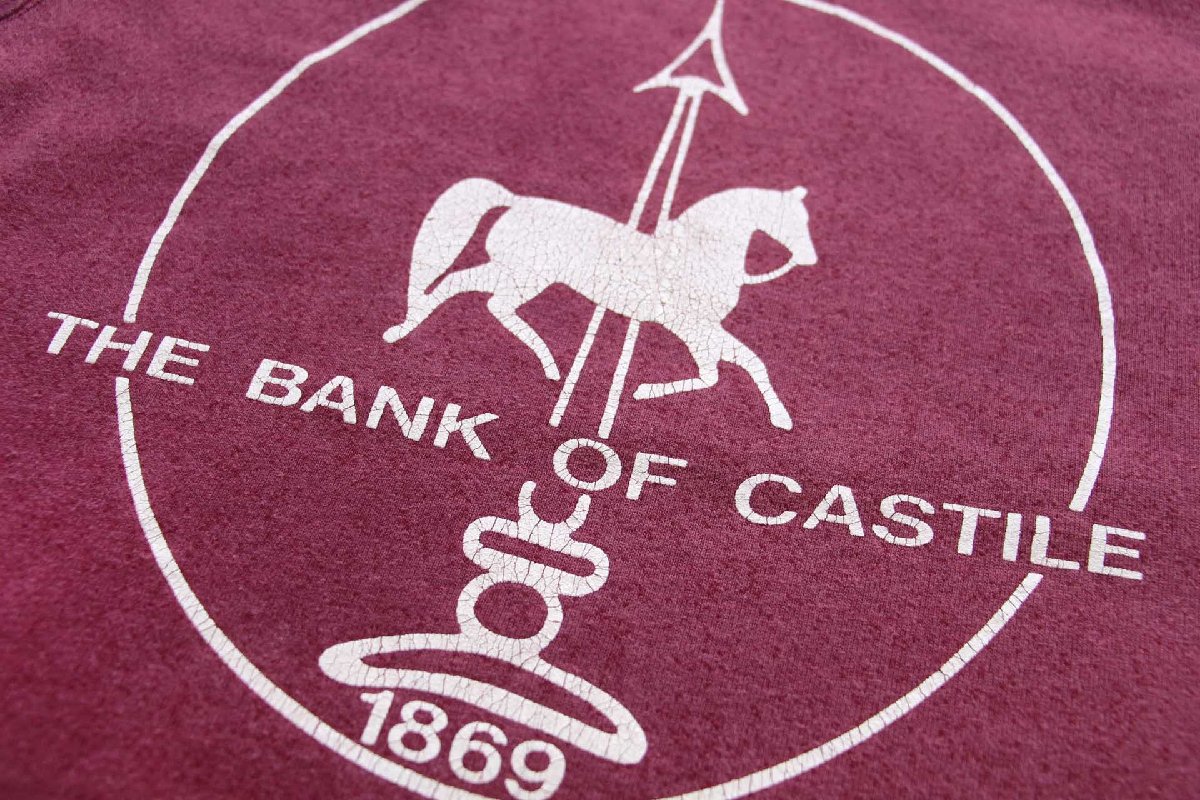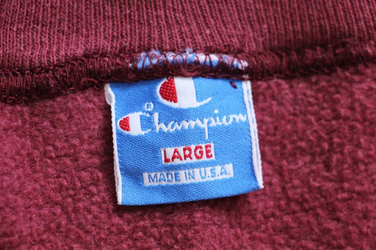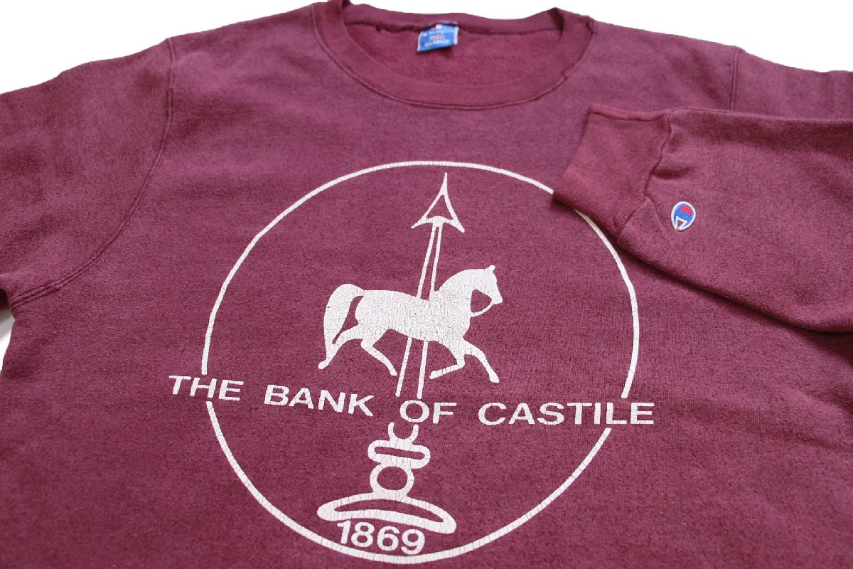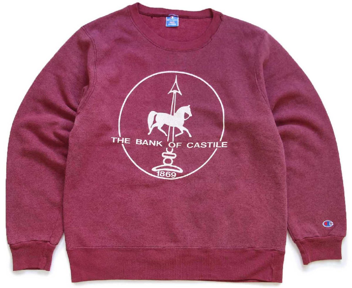 90s USA製 Championチャンピオン THE BANK OF CASTILE 1869 ひび割れプリント スウェット ワインレッド フェード L